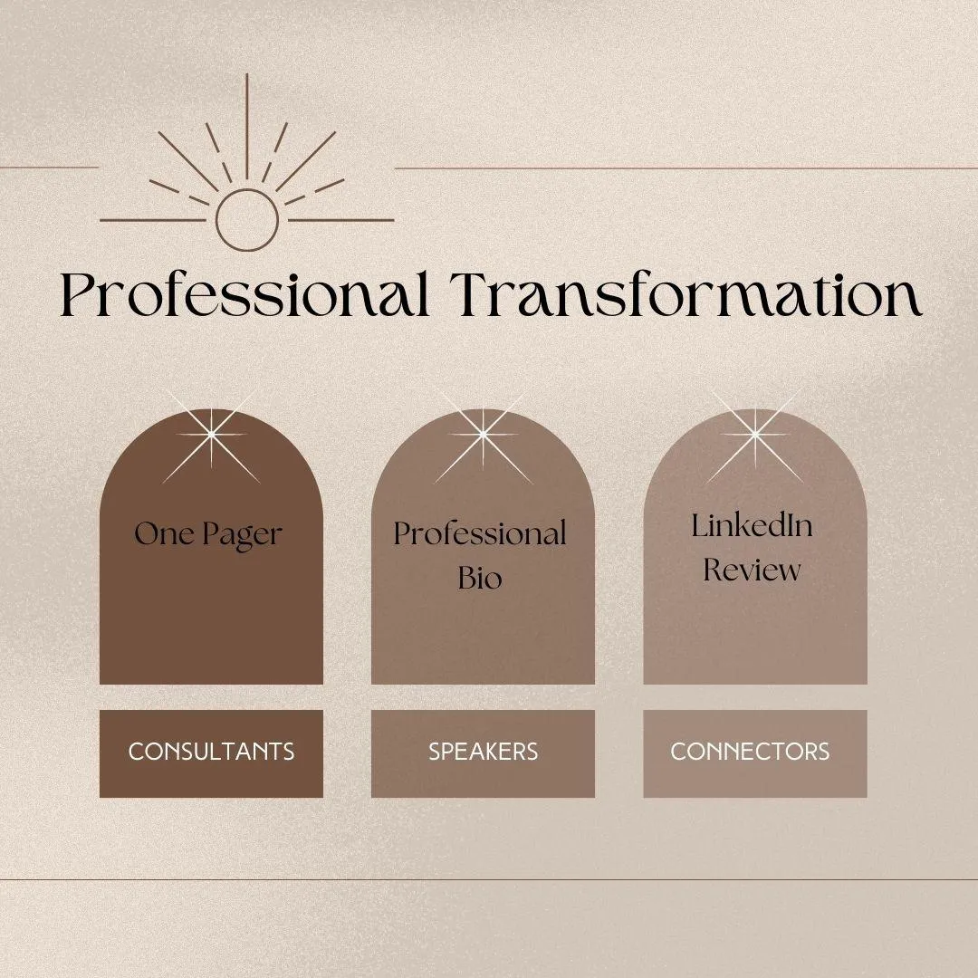 First, we'll collaborate to upgrade your resume to a high-level one-pager. Then, we'll create a custom professional bio that shares your story in your own words. Finally, we'll work together to customize and optimize your LinkedIn profile.